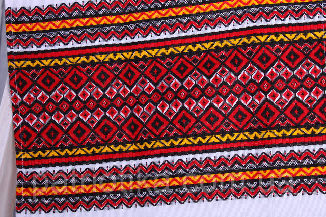 Рушник обрядовий весільний - незамінна символіка весільного торжества. Розстеляється під ноги молодим. Рушник тканий, виконаний у національному українському стилі. Оригінальний ромбоподібний узор вишитий чорними і червоними нитками з невеликою добавкою жовтих і оранжевих елементів. Розміри полотна - 34х220 см.